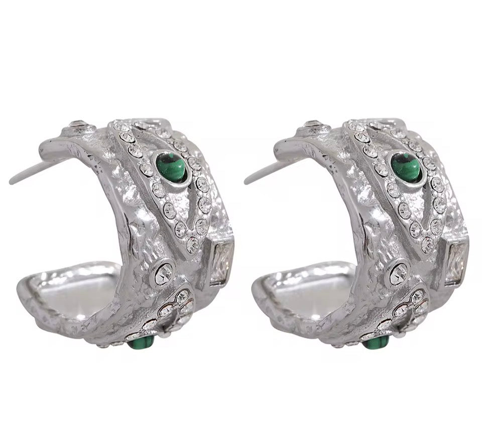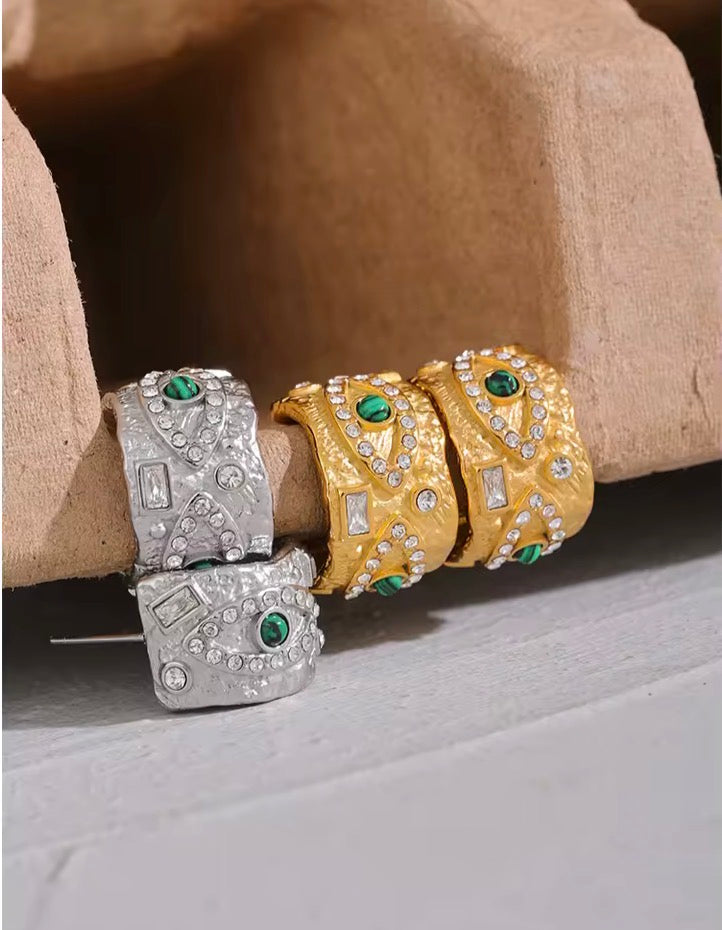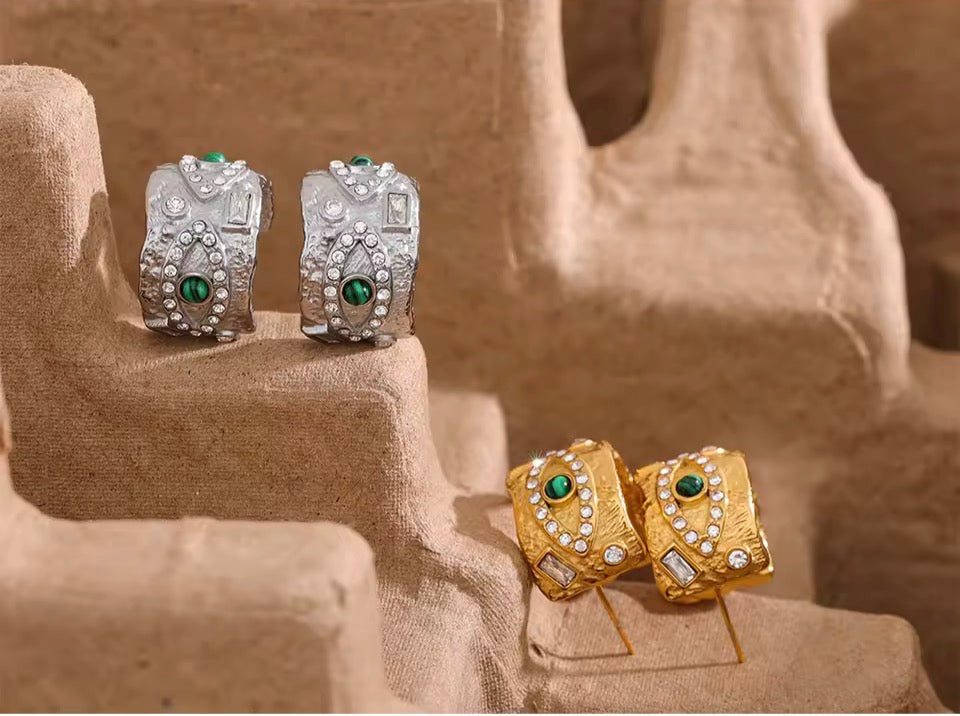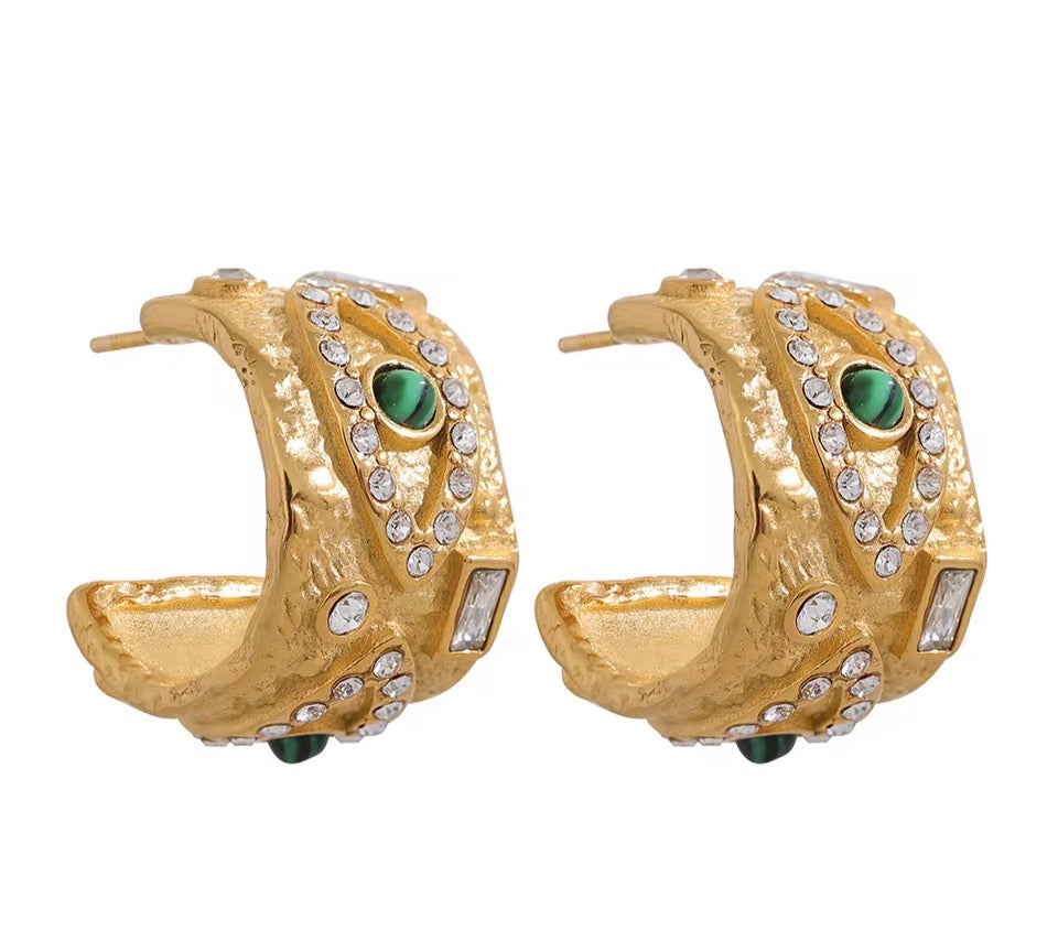 These sculptural hoops detailed with inset cubic zirconias annd a green malachite stone add a modern but also ancient feel about them with the evil eye detailing .These hoops balance statement presence and are great for elevating simple looks or anchoring an outfit with intention. available in gold plated or platinum , and same feel matching bangle.