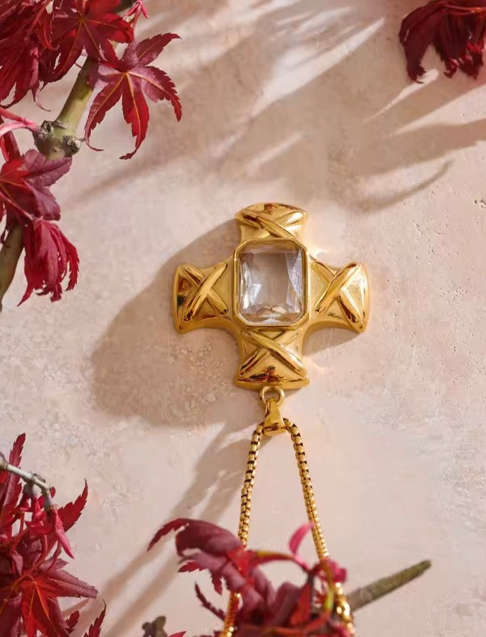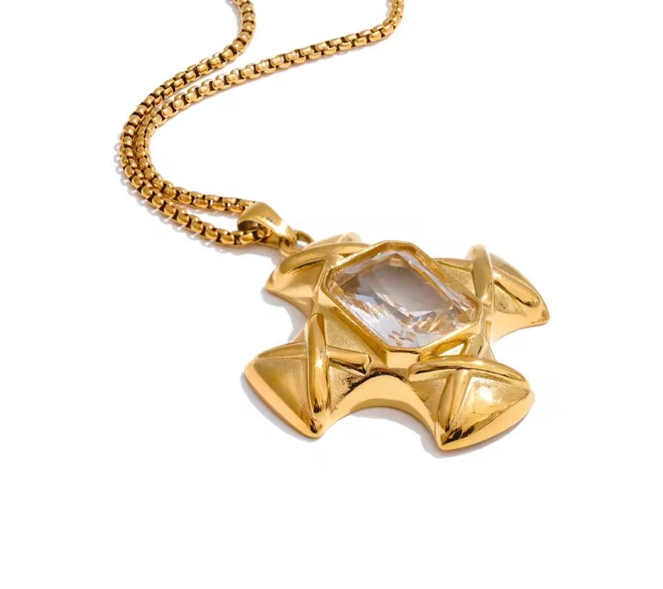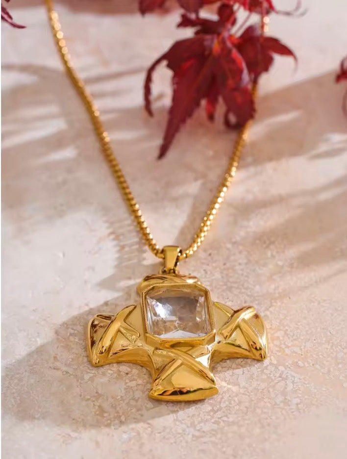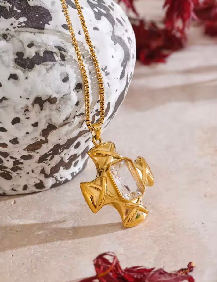 This 18K gold plated statement pendant is the kind of piece that instantly draws attention — the one you put on when you want to feel powerful, elevated, and effortlessly stylish. The sculpted gold design paired with the faceted crystal creates a striking balance of modern glamour and luxe sophistication.