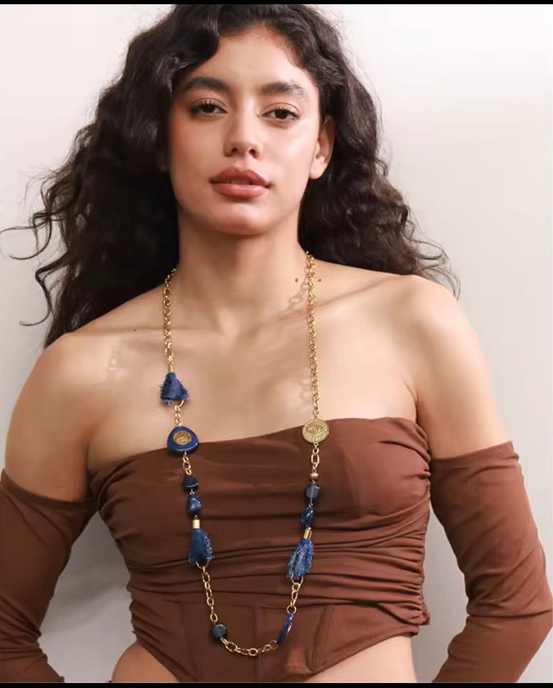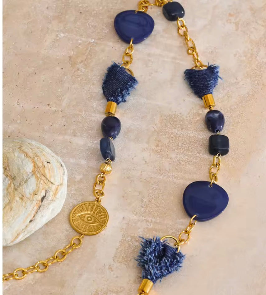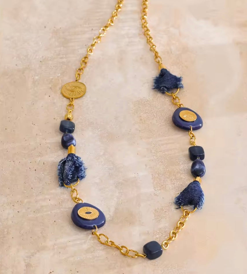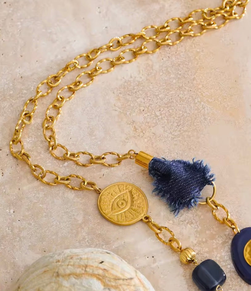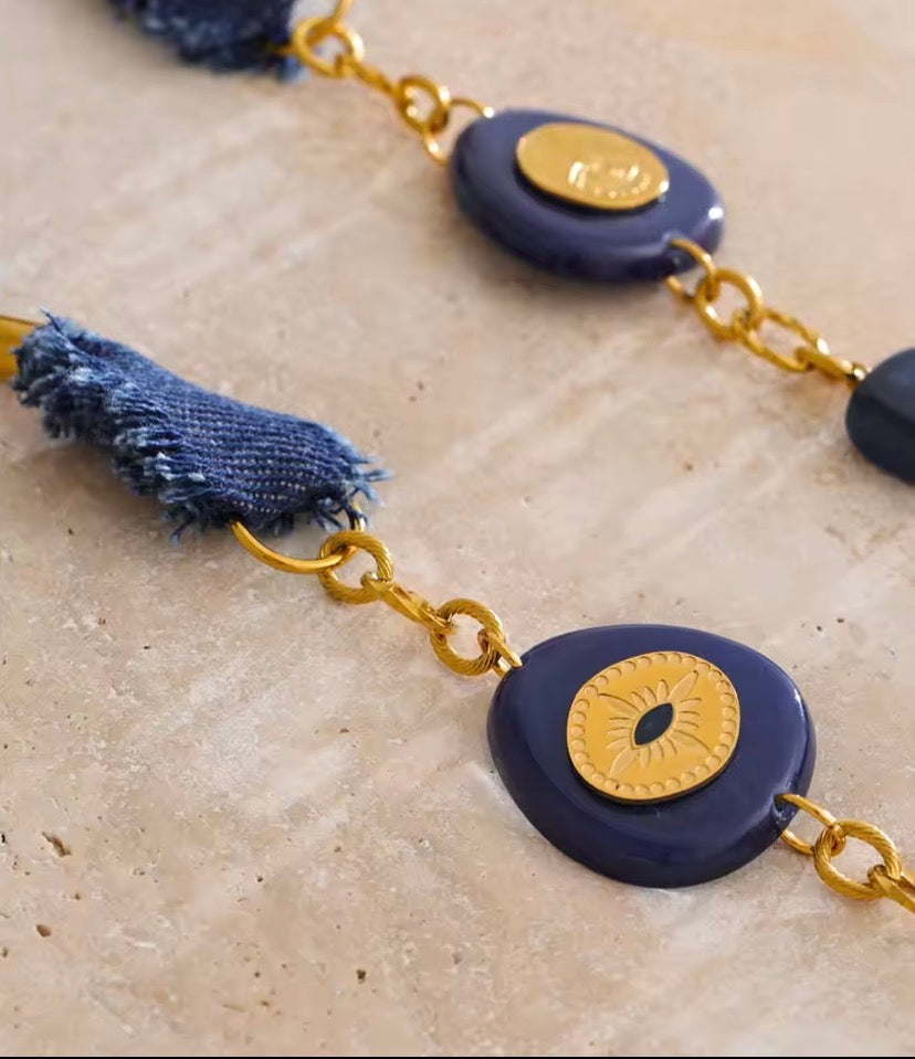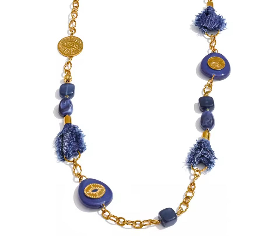 This 18K gold plated necklace blends chic denim textures, rich navy beads, and heart-shaped evil eye charms to create a look that’s bold, playful, and undeniably on trend for 2026. Long, on trend and edgy! Each element is crafted to protect, empower, and elevate — a modern statement piece with meaning behind every detail.
