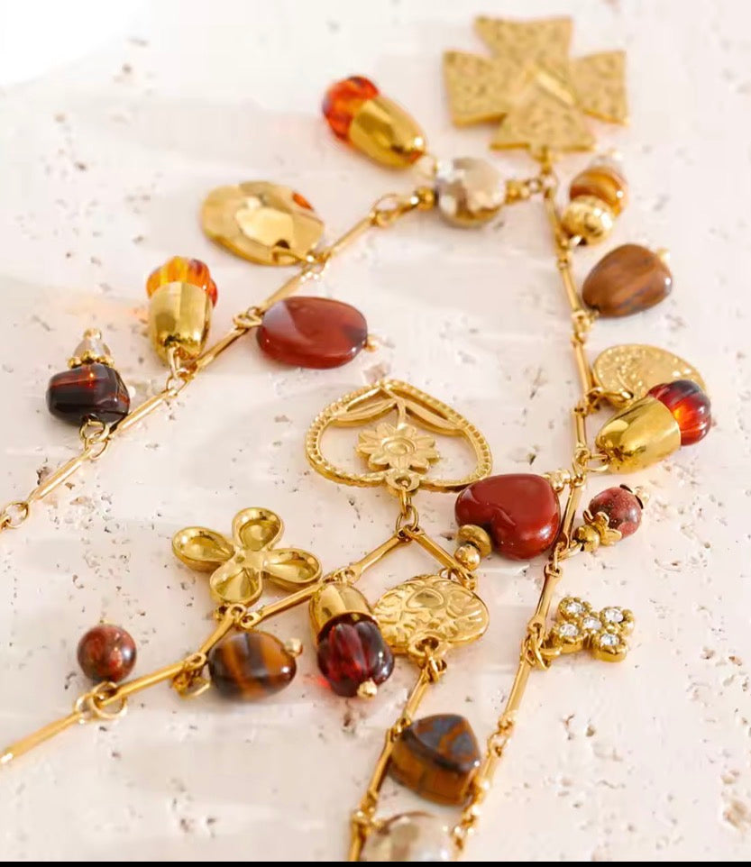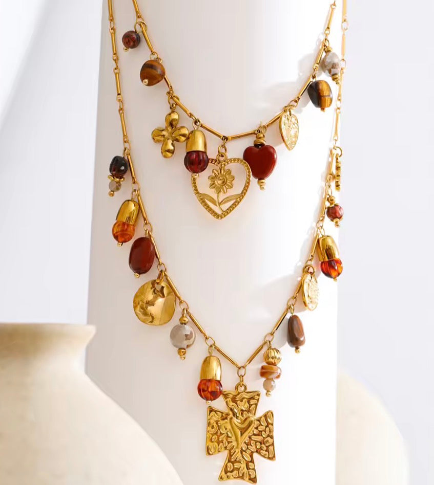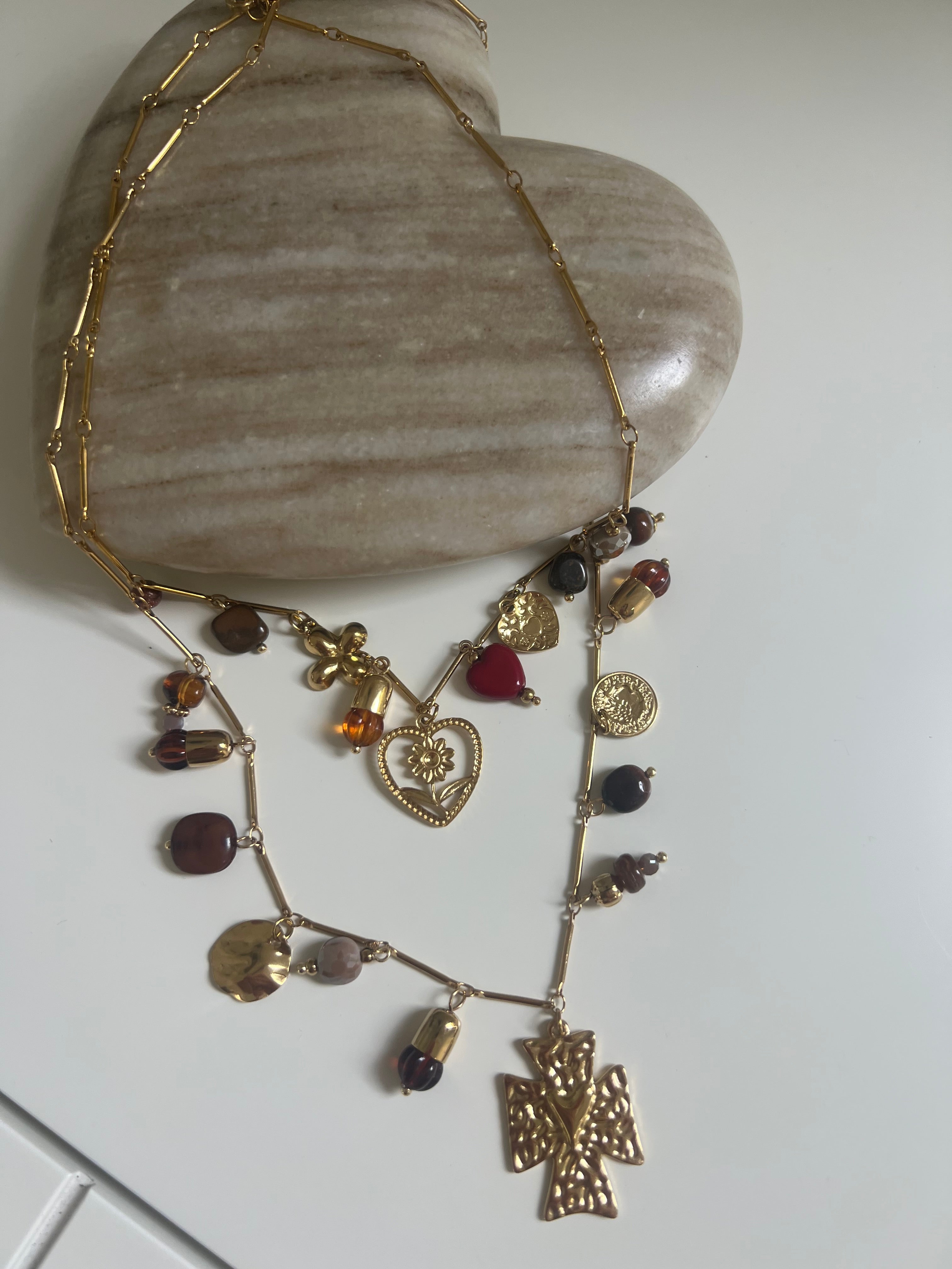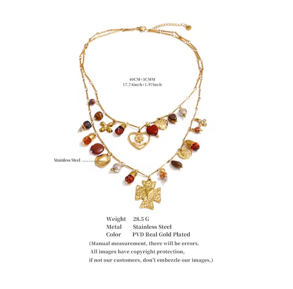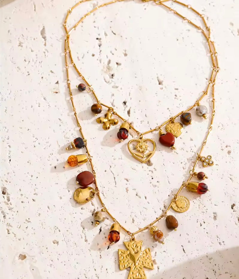 - 18K gold plated stainless steel necklace, crystal, glass beads, cross, devotion heart, etc detailing