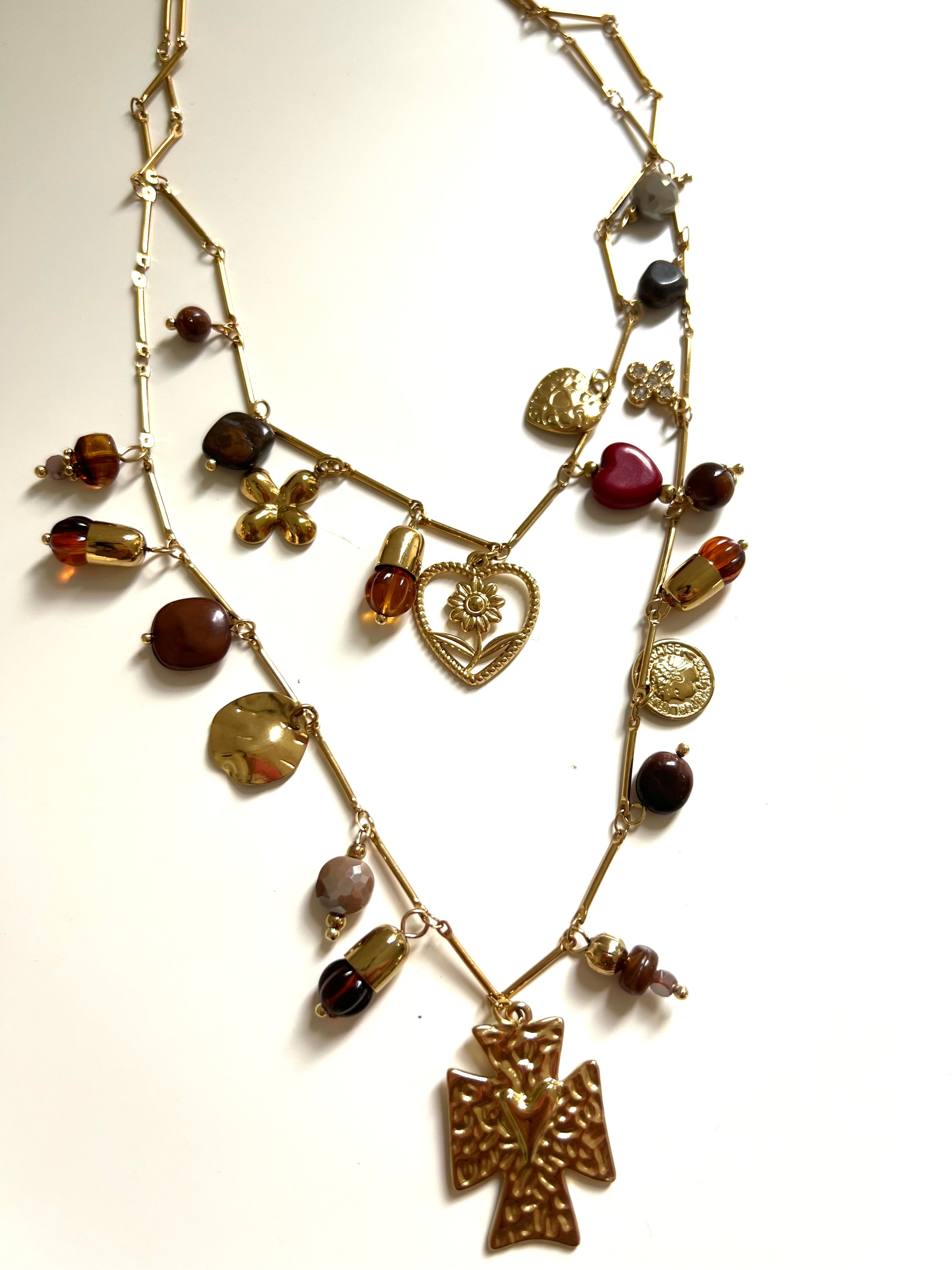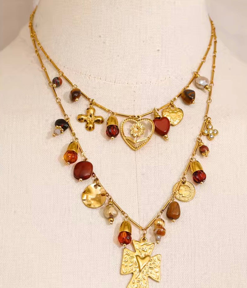 HON- MARCELLA- COIN/CROSS/HEART BEADED 2 LAYERED NECKLACE