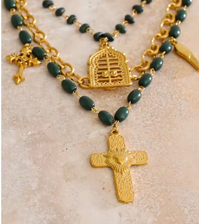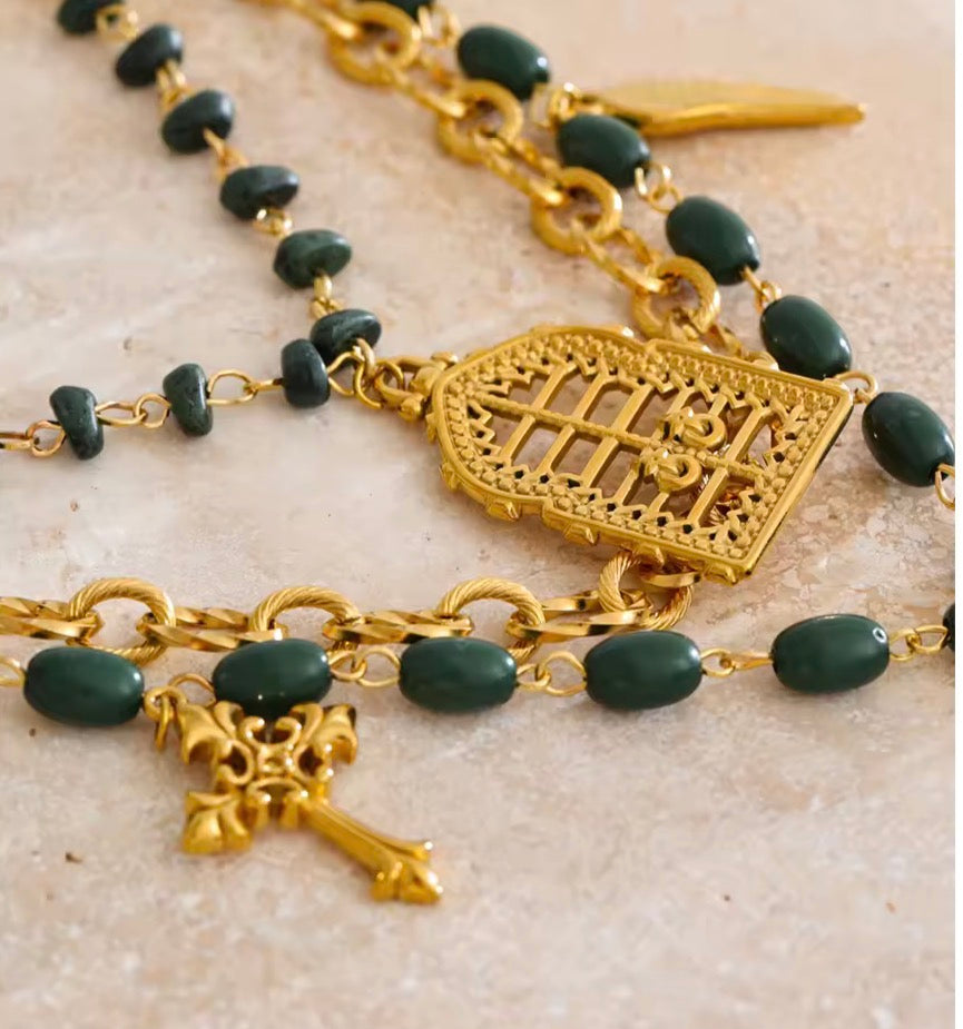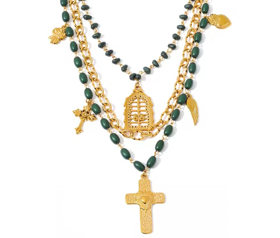 Adorned with crucifixes, love hearts, angel wings, roses, birdcage, green beads and a layer of smaller natural green stones bringing out the boho, gothic or even romantic in you. It all depends on the rest of your attire.
