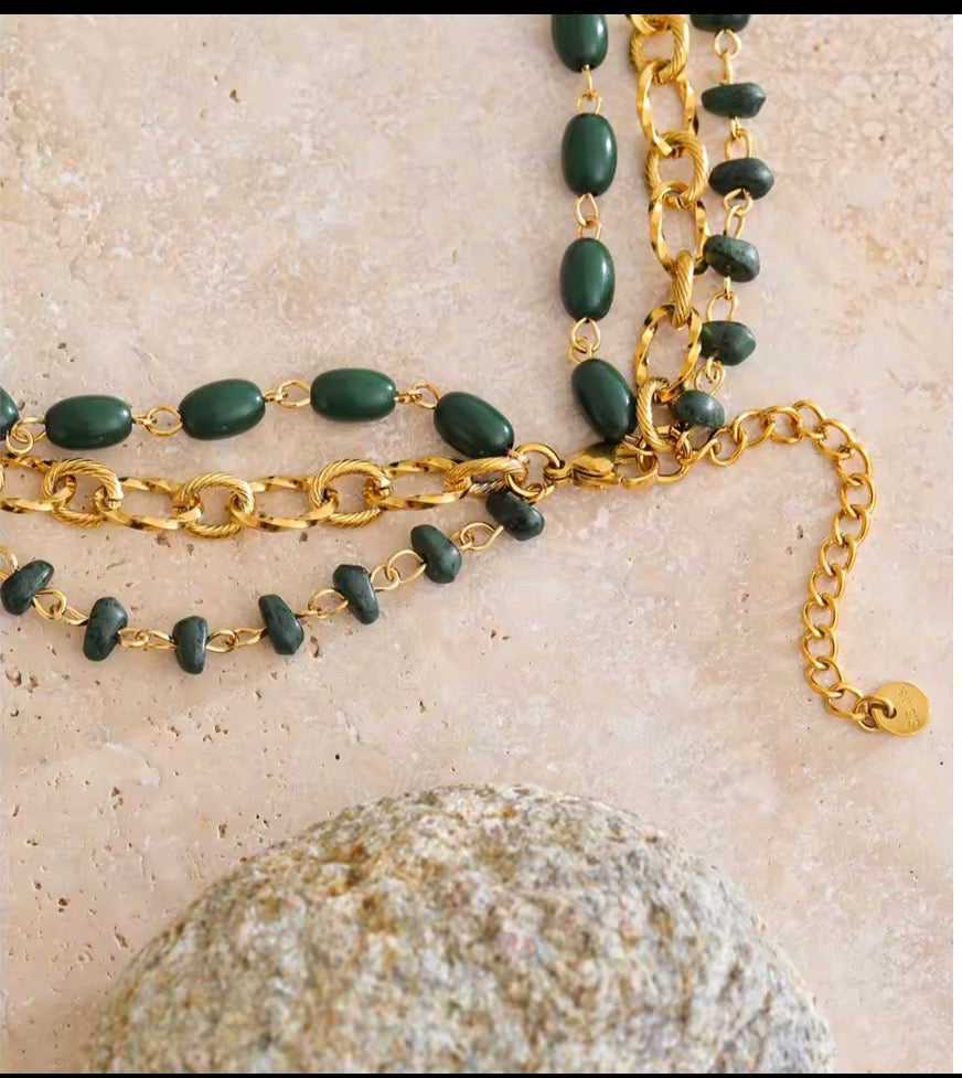 - 18K gold plated stainless steel necklace with charms, beads and natural stones