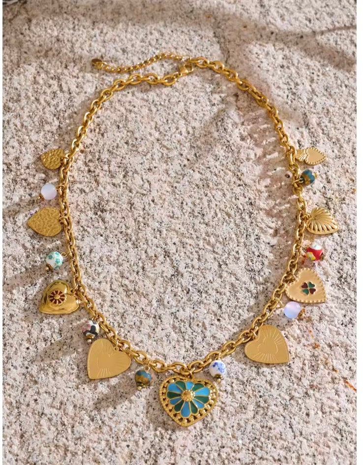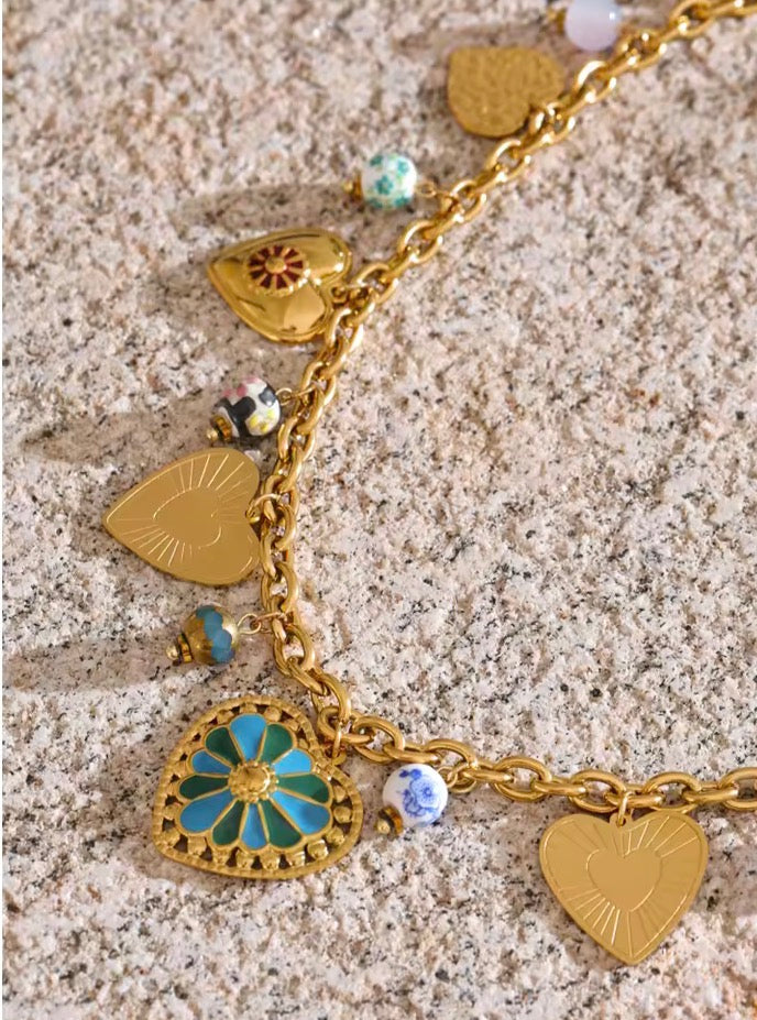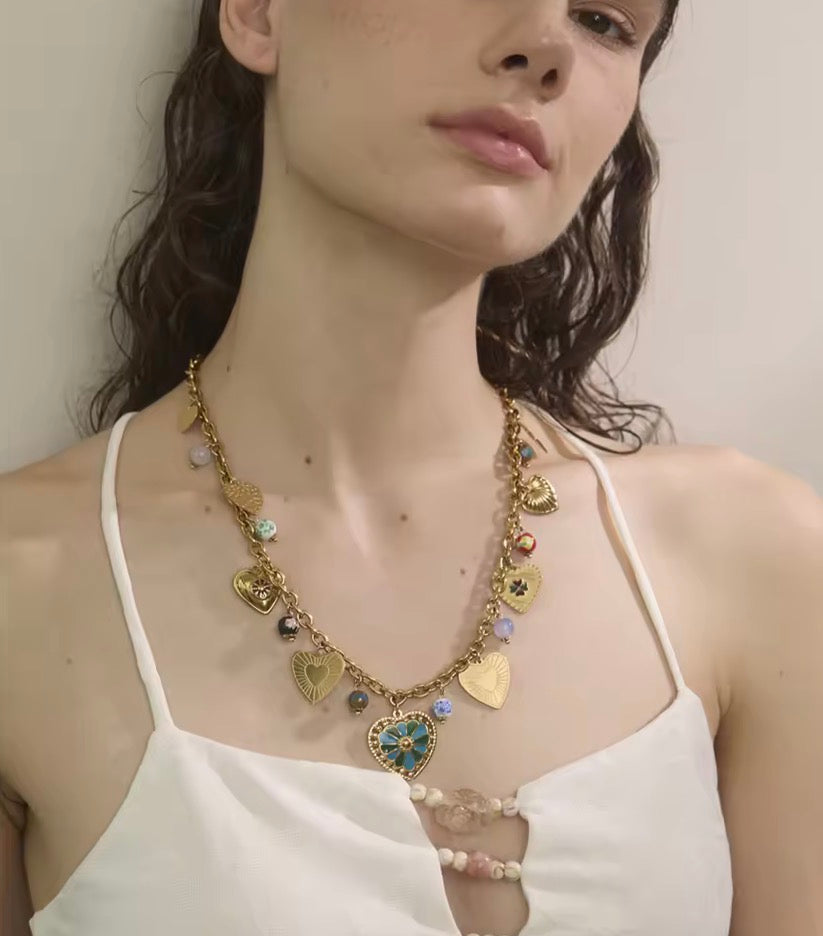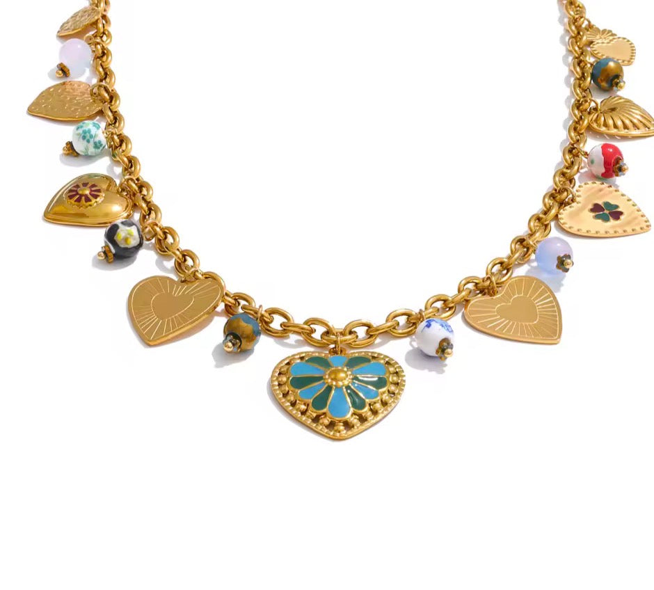 featuring a chunky chain with multiple unique heart charms some engraved , some painted mixed with glass and ceramic beads-it captures the perfect blend of nostalgia and modern fashion —a true statement piece full of artistic flair and passion.