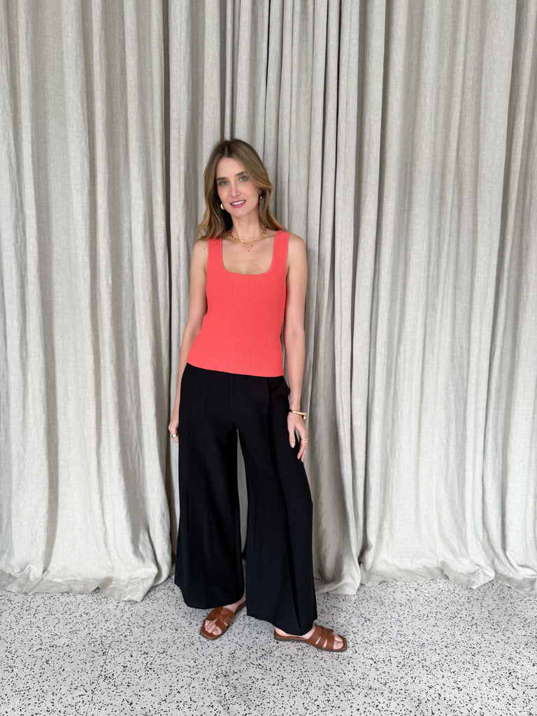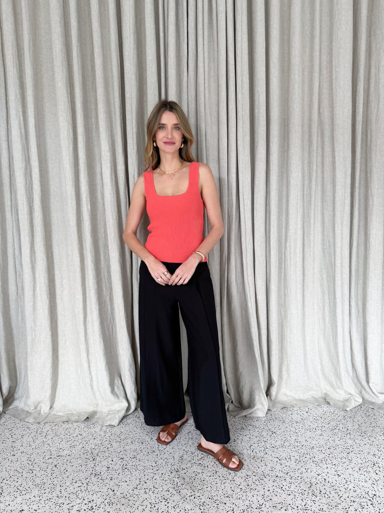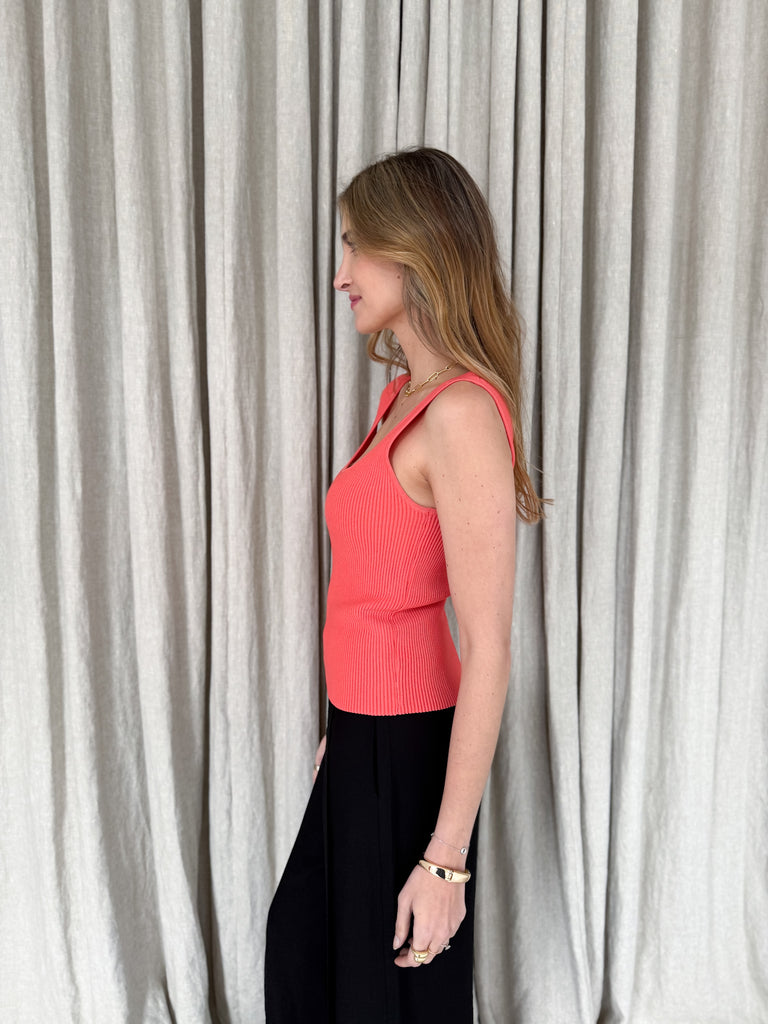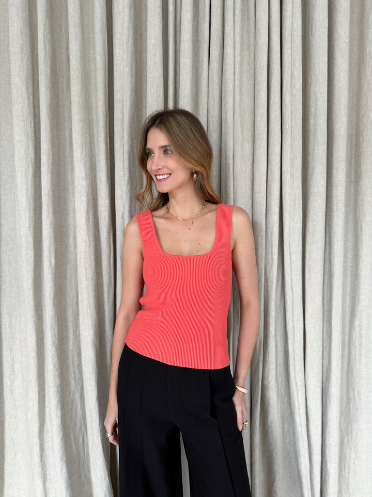 A deep tangerine ribbed singlet, great on its own or under blazers, denim jackets etc.