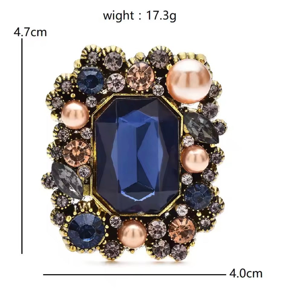 At the centre sits a deep midnight-blue faceted stone — bold, regal, unforgettable. Framed in warm gold and surrounded by a constellation of champagne crystals, smoky gems and luminous pearl accents, this intricate brooch feels like it belongs in a vintage jewellery vault… yet styles effortlessly with modern fashion.