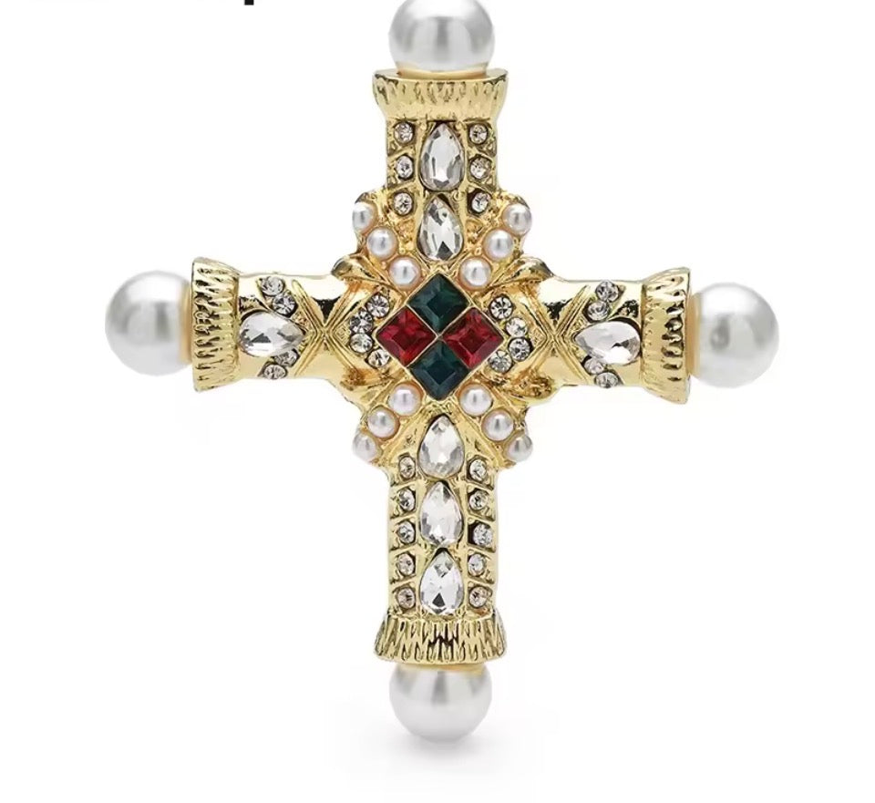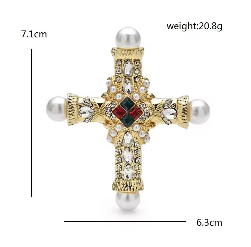 Ornate yet refined, this statement cross brooch blends luminous imitation shiny pearls, faceted crystals and rich jewel-toned accents in a striking gold setting. Inspired by royal insignia and heirloom treasures, it’s designed to elevate instantly and leave a lasting impression.