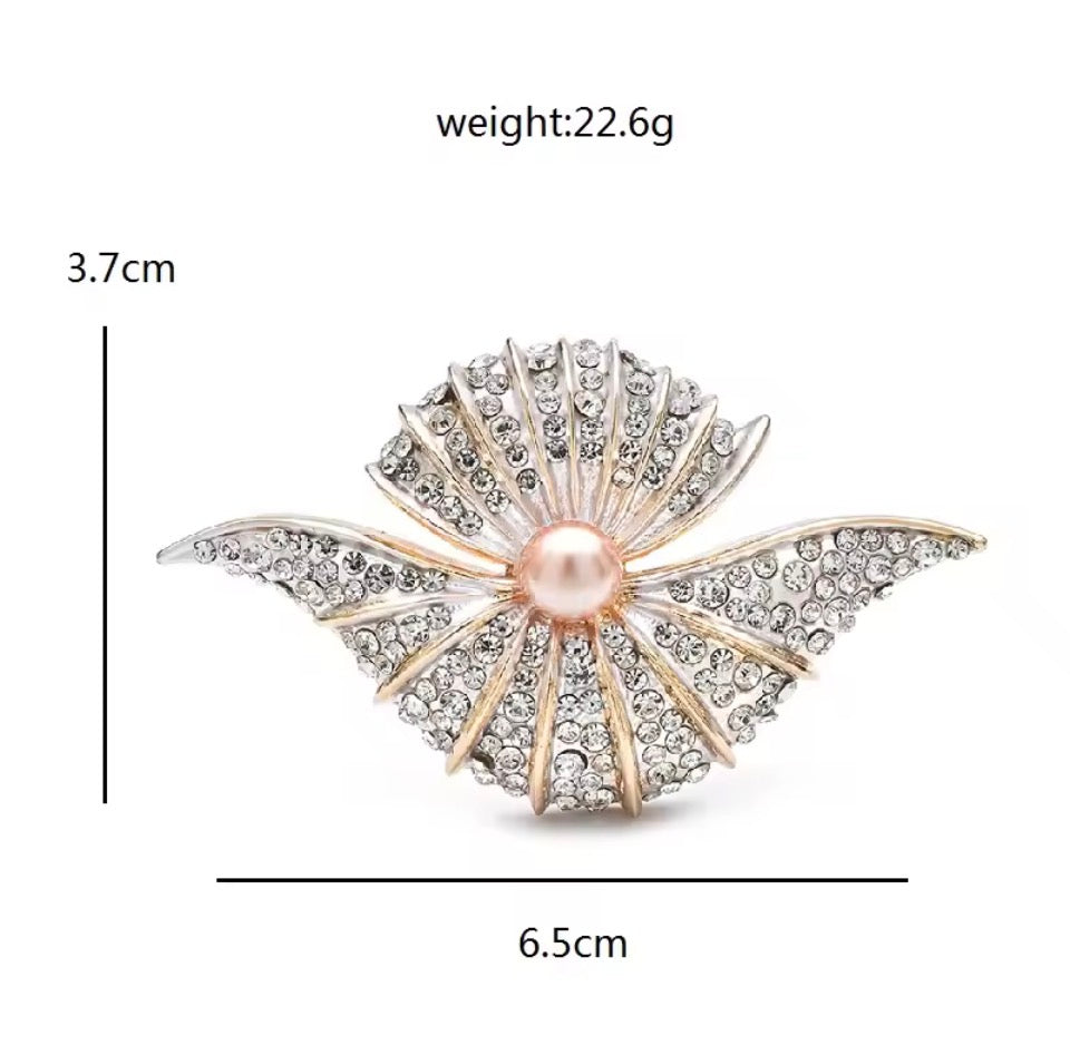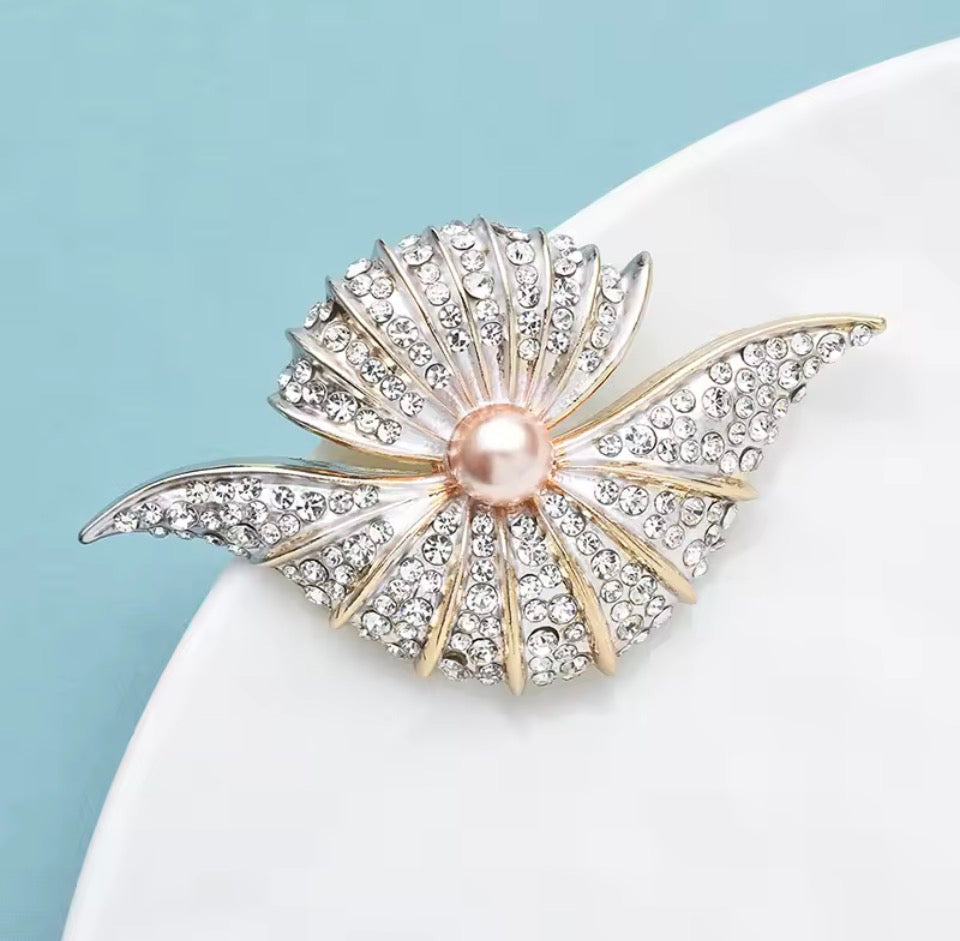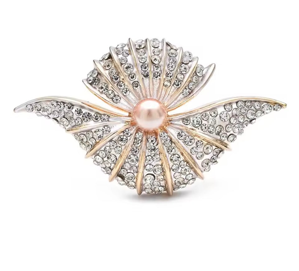 A sculptural shell silhouette encrusted in shimmering crystals, finished with a luminous blush pearl centre — this brooch captures light, attention, and quiet confidence in one refined statement.