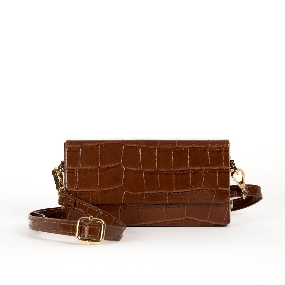 The Margot box clutch/cross over body bag is a refined everyday essential crafted from glossy crocodile embossed leather. Its compact yet structured silhouette makes it an elegant choice for both day and evening wear.