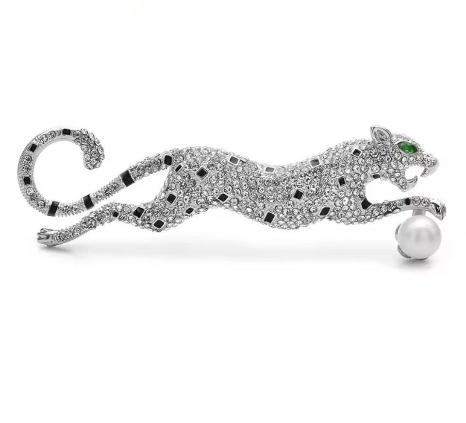 Designed as a leaping leopard, fully encrusted in shimmering crystals with striking black accents and piercing green eyes, this intricate piece captures the raw beauty of strength and sophistication. A luminous pearl detail adds contrast and refinement, balancing wild energy with timeless elegance.