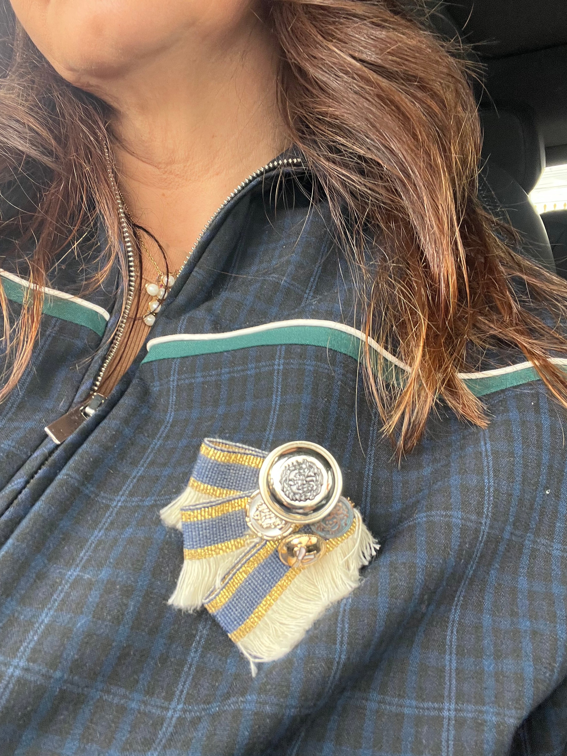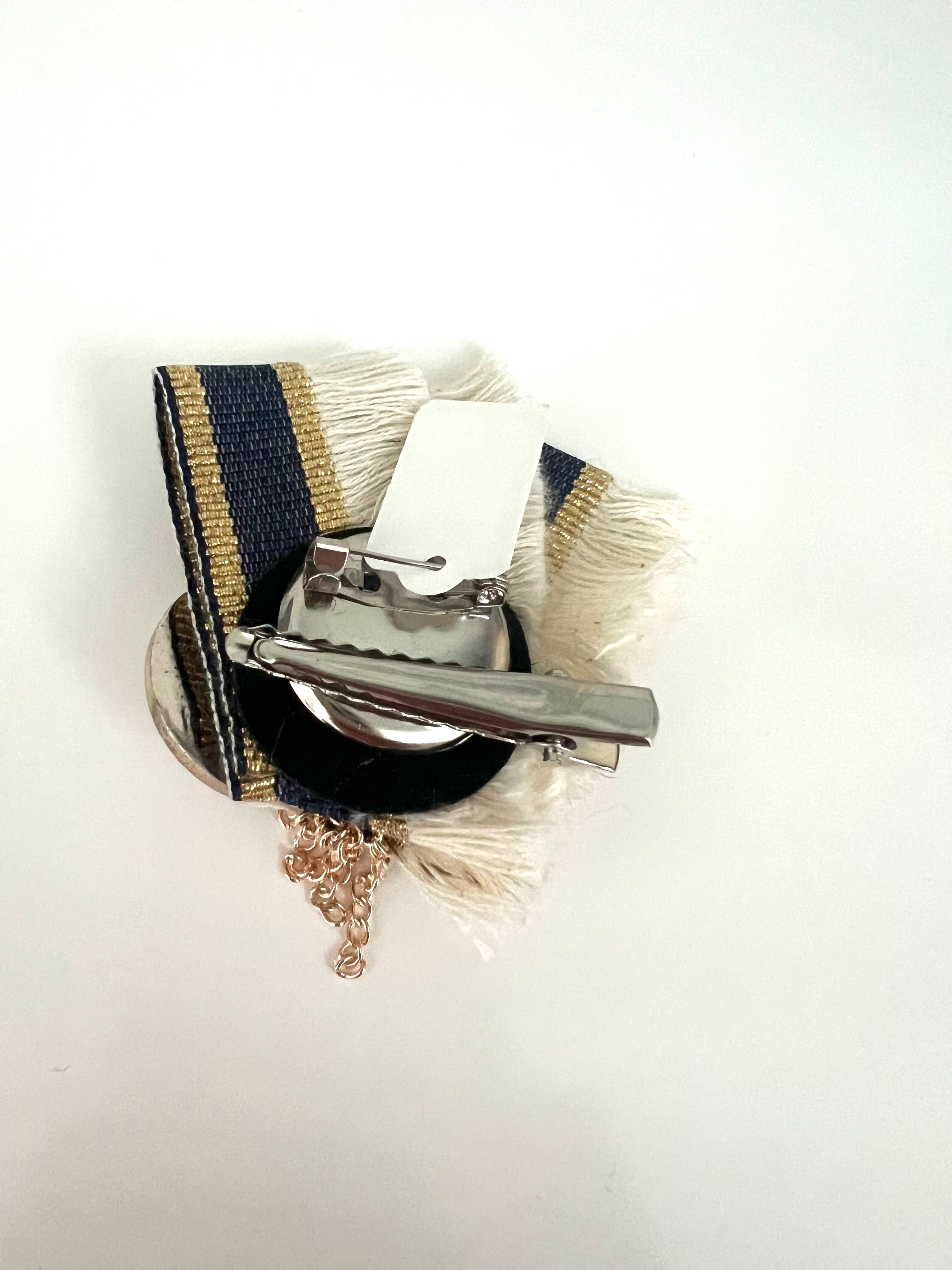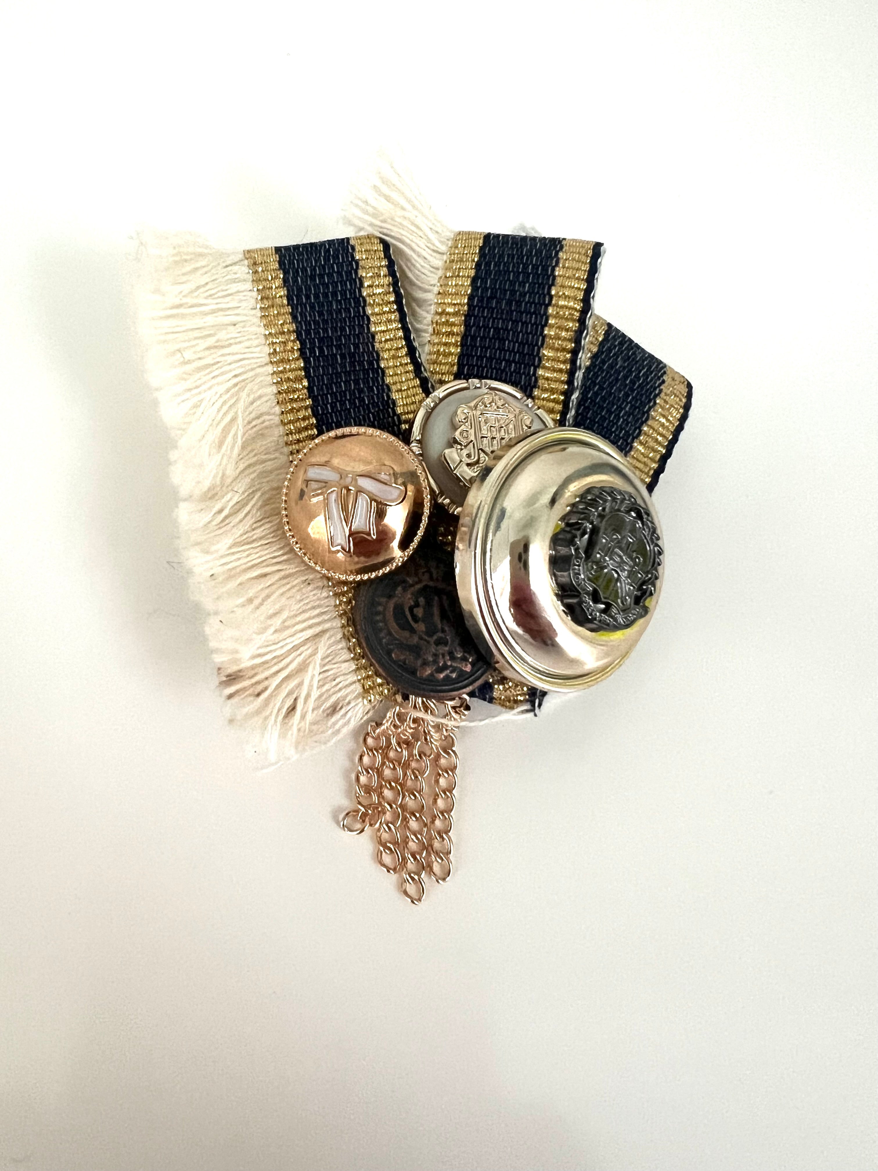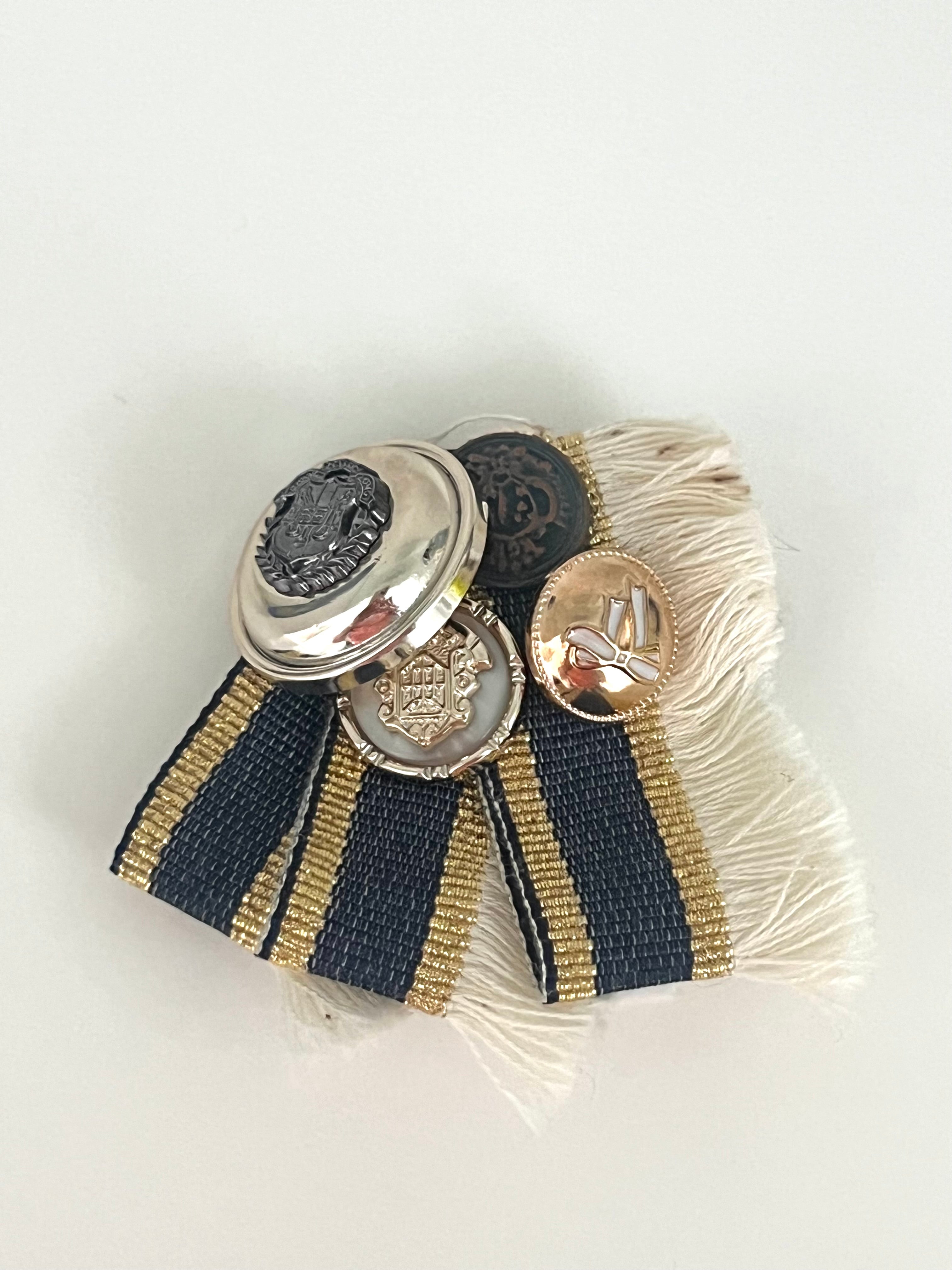 Inspired by vintage military medals and old-world insignia, The Aristocrat Ribbon Brooch blends polished metallic emblems, textured ribbon detailing and soft tassel fringe into one distinctive piece. It feels curated, collected — like something discovered in a European antique market.