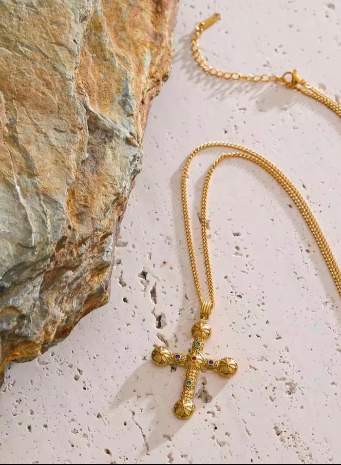 A beautifully adorned Byzantine style cross with floral grooves and multi colour zirconias on a long chain.  Long pendant necklaces are very on trend for 2026, but you can easily pop it on one of your own chains, or even layer it. Bringing the old back with style, feminine and faith.
