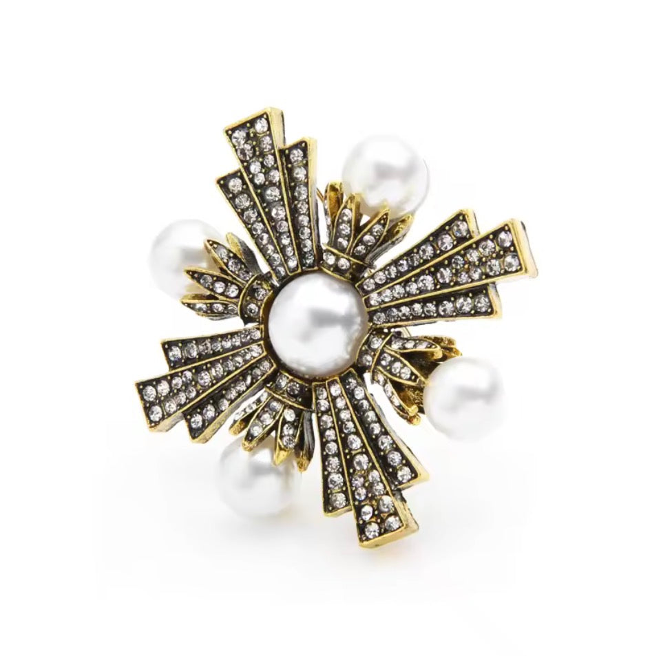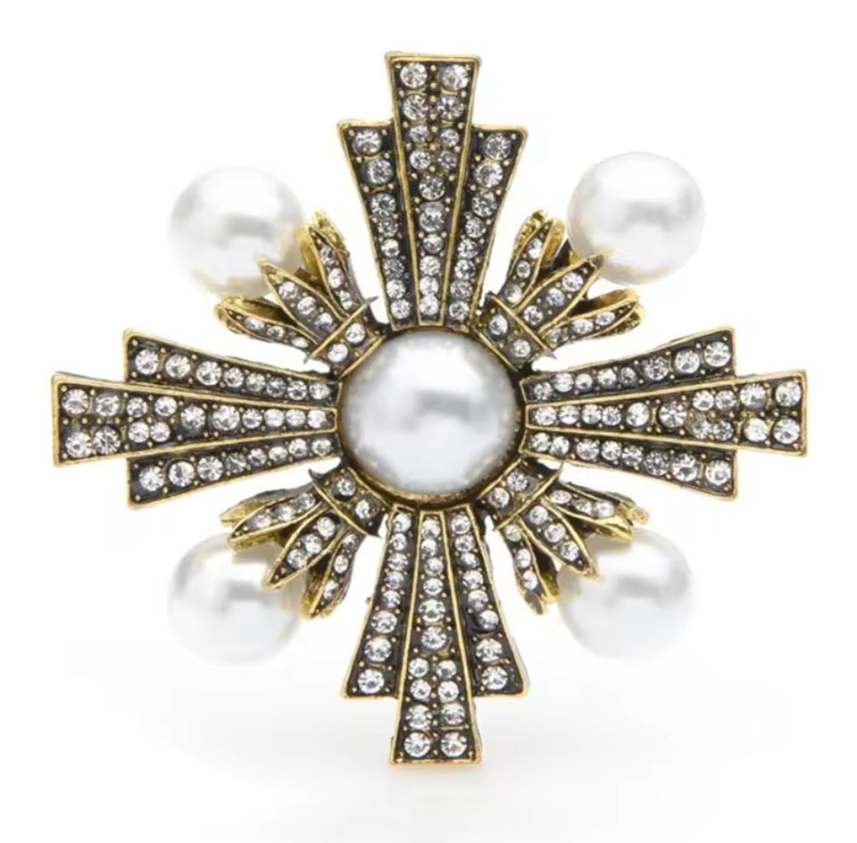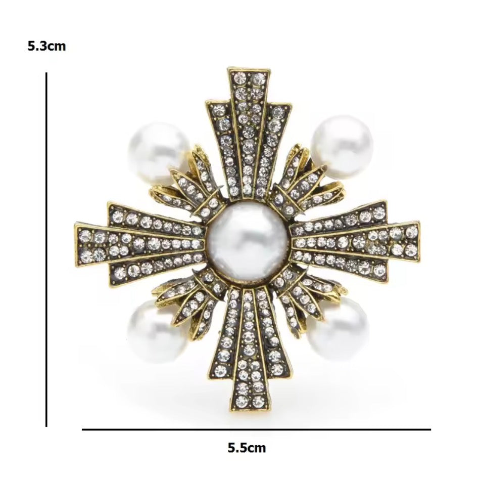 Designed to evoke palace treasures and heirloom elegance, The Imperial Pearl Cross Brooch is a bold statement of grace and authority. Featuring a radiant imitation pearl centre, surrounded by shimmering crystal detailing and finished with soft pearl accents, this piece balances strength with femininity.