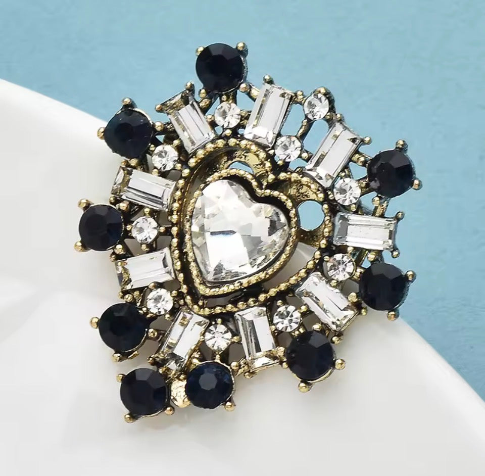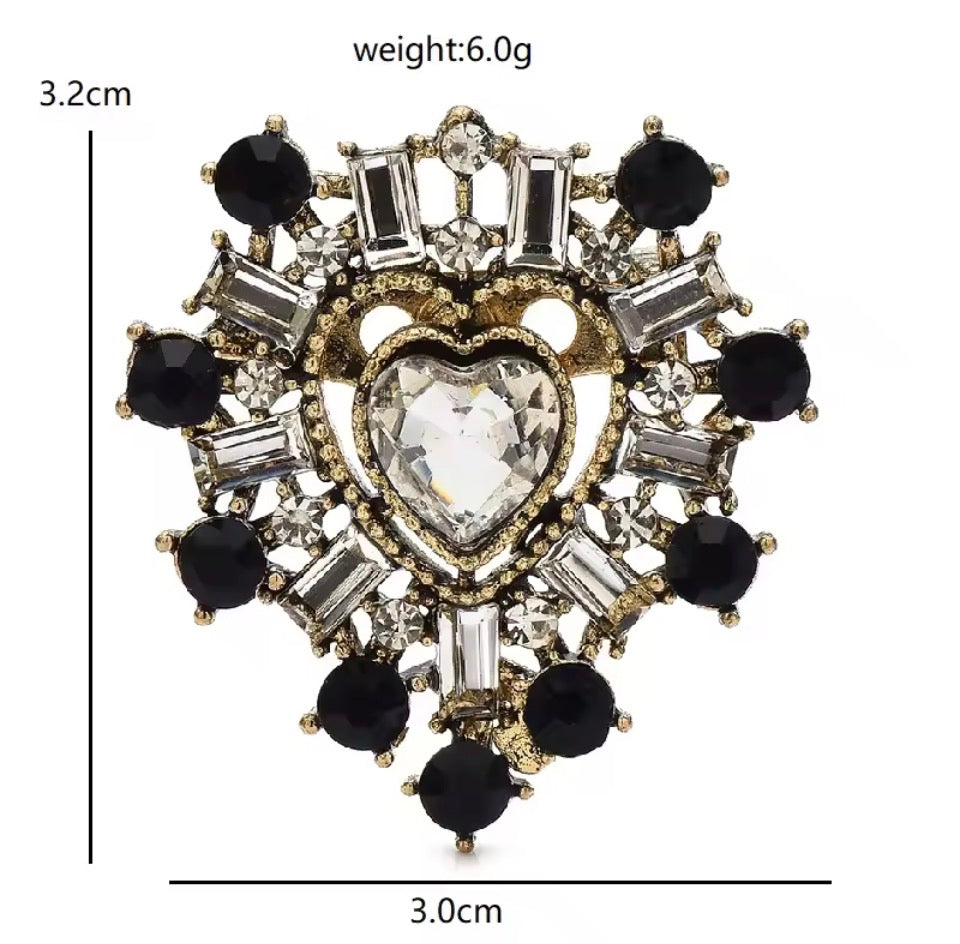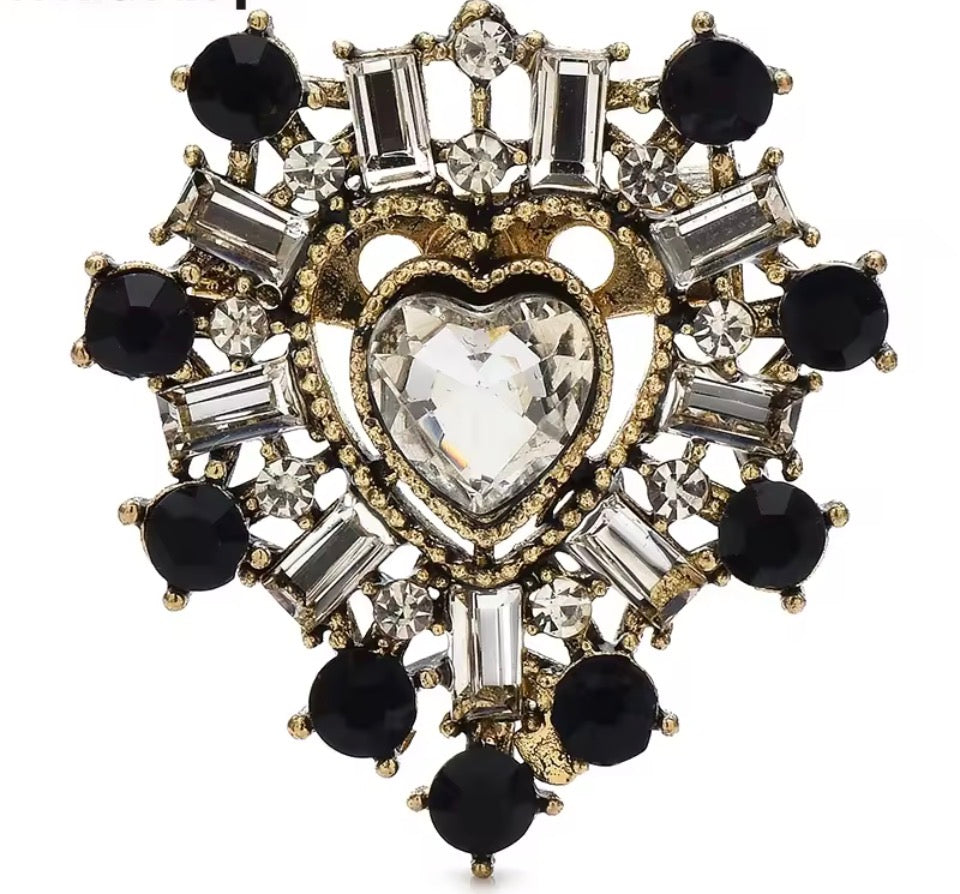 Framed in an vintage gold setting, surrounded by navy stones and brilliant baguette crystals, and centred with a faceted heart that captures light from every angle — this brooch feels like it belongs in a royal treasure collection.
