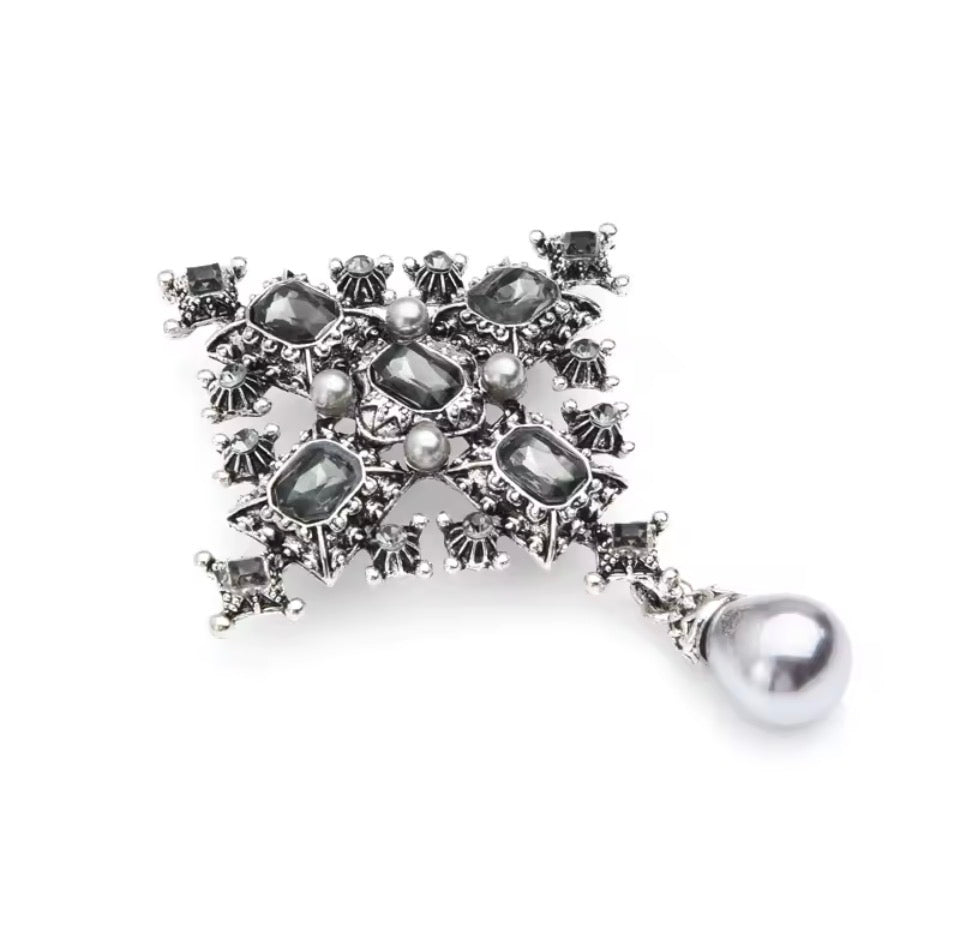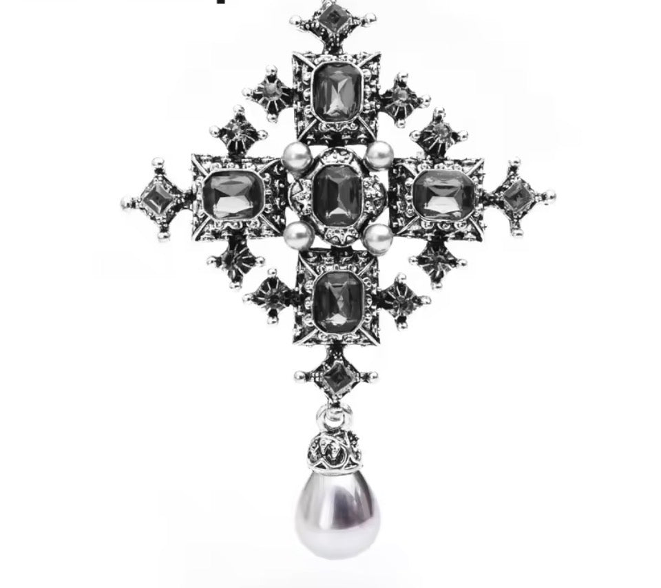 The Sovereign Brooch is a striking, heirloom-inspired piece designed for women who carry presence naturally. Featuring faceted charcoal-toned stones set in an intricate cross silhouette, accented with delicate imitation pearls and finished with a dramatic imitation pearl drop, this brooch radiates old-world grandeur with contemporary edge.