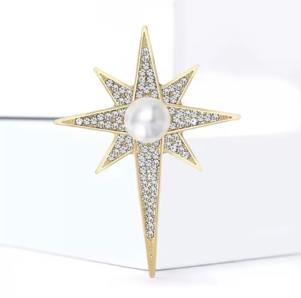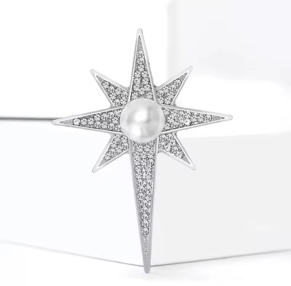 A radiant starburst design centred with a luminous imitation pearl and framed in micro crystal detailing — this brooch is pure statement elegance. Bold yet refined, creating a soft glow that instantly elevates your look.